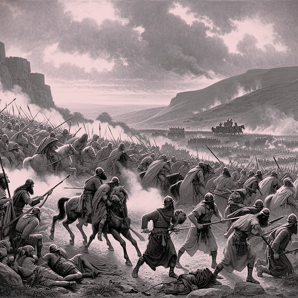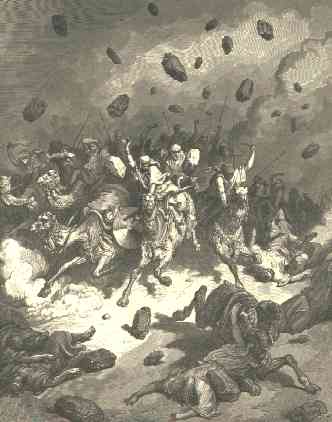 Joshua and his forces surprised the enemy by their night march and quickly turned the battle into a slaughter. As the coalition forces struggled to regroup, they retreated west toward Beth-horon but they were met with the intervention of God who dropped large hailstones on them from heaven. The hailstones inflicted more casualties than the Israelite weapons.