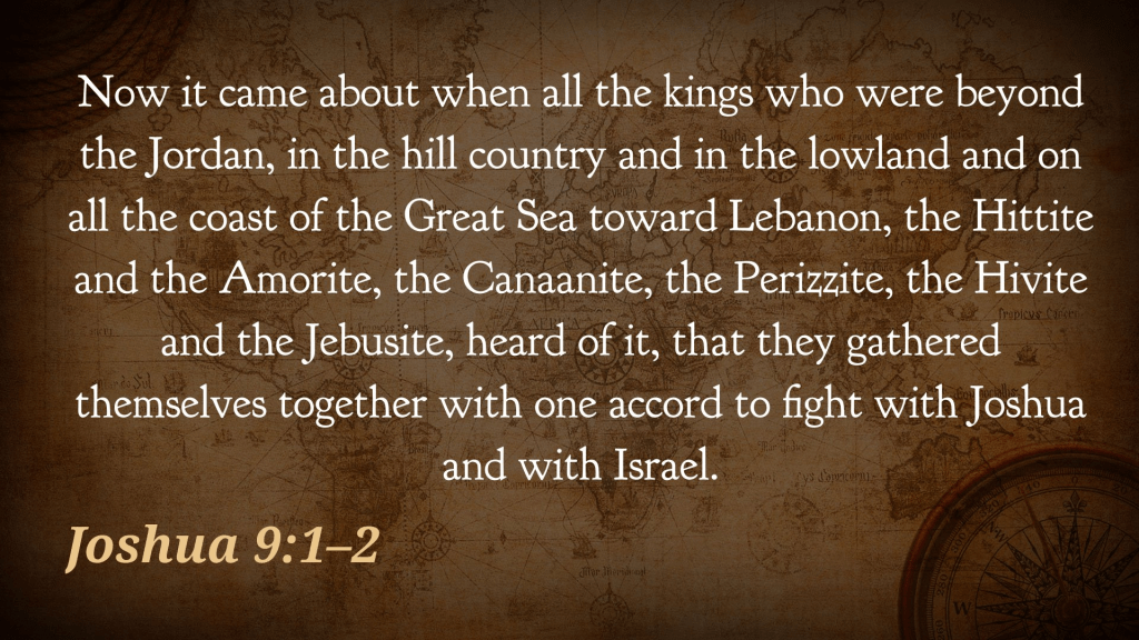 After the conquest and destruction of Jericho and Ai, Joshua and the Israelite army brought great fear on the kings of the cities that lay in their path. These kings considered their options, and a combined military partnership seemed to be the best response. There was a group with an opposing view–the Gibeonites. The people of Gibeon were the one group of the Canaanites that concluded that it was certain death to oppose Joshua and the Israelites because of the power of their God who fought for them. They knew and witnessed the Israelite policy of destroying and leaving no survivors of those that opposed their conquest of the land. They took a risk and formulated a plan of deception in order to surrender to the Israelites and become their servants. A group of them disguised themselves as people from a far-off nation and made an agreement with Israel that they would serve them in exchange for peace. The Israelites agreed and made an oath to not harm them. It was later discovered who they really were, but the Israelites were bound by their oath to exclude them from destruction. They were allowed to live but they would serve Israel for the rest of their days.
